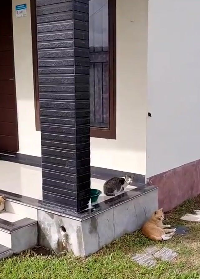A stationary, eye-level outdoor shot shows five cats on and around the porch of a house