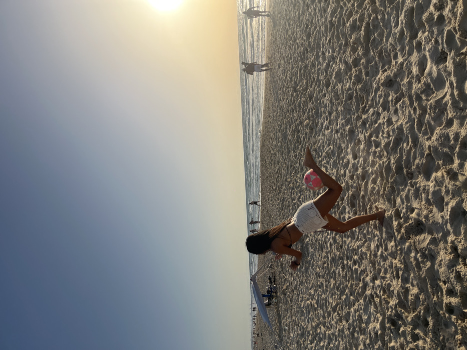 The image depicts a vibrant beach scene in Rishon LeZion, Israel, during the late afternoon or early evening as the sun approaches the horizon. The sky transitions from light blue overhead to a warm, yellow-orange glow on the right, where the bright sun is visible. In the foreground and central to the image, a lean individual, presumed female, with dark hair, is captured in motion on the sandy beach. She wears a dark bikini top and white, semi-sheer crochet shorts. Her body is angled left, with her left leg extended backward, making contact with a pink and white soccer ball, propelling it forward. Her arms are bent at the elbows and held in front of her body. The sand beneath her and extending across the foreground is light brown and textured with footprints. In the mid-ground, multiple indistinct figures are scattered across the expansive beach. To the left, several people are visible near a light-colored, elongated canopy or tent. Further right, closer to the ocean's edge, additional individuals are visible, some engaged in what appears to be ball play near the breaking waves. The Mediterranean Sea stretches across the background, showing gentle waves rolling onto the shore beneath a clear horizon.