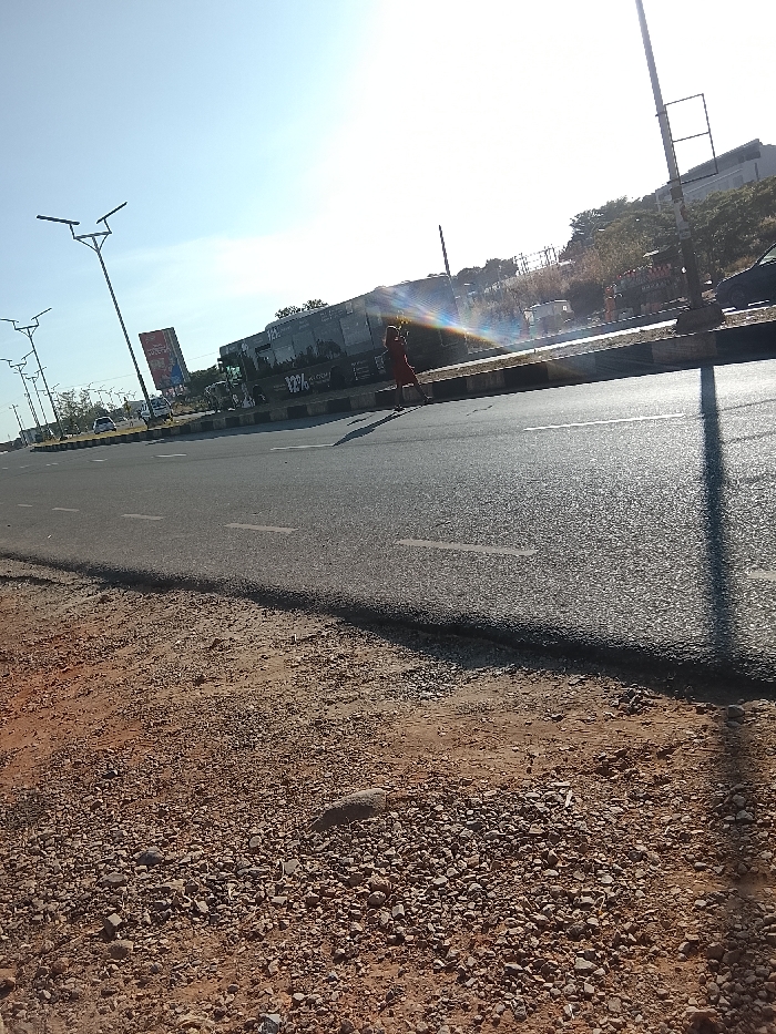 The image displays a slightly tilted, low-angle view of a multi-lane asphalt road under a bright, clear sky in Jos, Plateau State, Nigeria, specifically along the Kaduna-Jos Road, given the presence of "Grand Cereals" and "Jos" on a visible banner. The foreground consists of reddish-brown dirt and gravel with scattered stones. The paved road features white dashed lane markings and a black and yellow painted concrete median. A single individual, dressed in red attire, is positioned near the median on the far side of the road, casting a shadow to their left. Behind this person, a large, dark-colored vehicle or building, possibly a bus or truck, is visible, bearing text that includes "Grand Cereals" and "Jos," indicating the company "Grand Cereals Limited." Further down the road on the left, a tall billboard with a red frame displays an advertisement. Multiple streetlights with distinctive dual horizontal fixtures line the left side of the road. The bright sunlight from the upper right creates distinct shadows and a prominent rainbow-colored lens flare across the middle-right portion of the image, intersecting the road and the large vehicle. Other vehicles are partially visible in the distance, and the far background includes faint trees and structures.