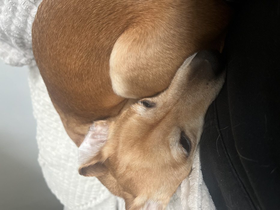 The scene depicts a domestic interior in Pernik, Bulgaria. A light-brown, short-haired dog is observed resting, curled on what appears to be a person's lap and a textured white blanket. The dog's head is positioned on a dark, likely black, fabric, identified as clothing, with visible light-colored fur strands on its surface. Its eyes are partially closed or cast downwards, and its ears are relaxed. The dog's predominantly light-brown body forms a tight, coiled posture against the white, patterned textile. The background features a blurred light-grey and white surface.