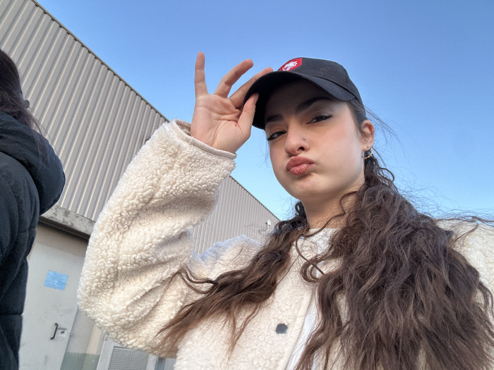 - "A young woman with long, curly brown hair, wearing a black baseball cap with a red and white logo and a cream-colored sherpa jacket, poses for a selfie" by FM-vVQbp1, licensed under CC BY 4.0