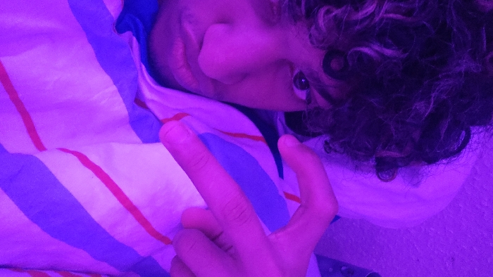 A close-up, artificially illuminated portrait captures an individual indoors, presumed to be in Kamenz - Kamjenc, Germany. The scene is bathed in a pervasive magenta-purple light, saturating all visible elements. The subject, positioned centrally, is visible from the upper chest to the top of the head, with the face turned slightly towards the left. Distinct dark, curly hair frames the upper left portion of the head. The left eye, nose, and part of the mouth are discernible, with facial features obscured by the intense purple light. The individual is wearing or partially covered by a fabric featuring prominent horizontal stripes of white, blue, and red. The subject's right hand is raised, with the index finger and thumb extended, forming a gesture, while the other fingers are curled. The extended index finger points towards the lower-left. A white surface, consistent with bedding or a pillow, is partially visible behind the subject's head. The immediate environment is an interior space, likely a room, with no further specific details discernible due to the close crop and lighting conditions.