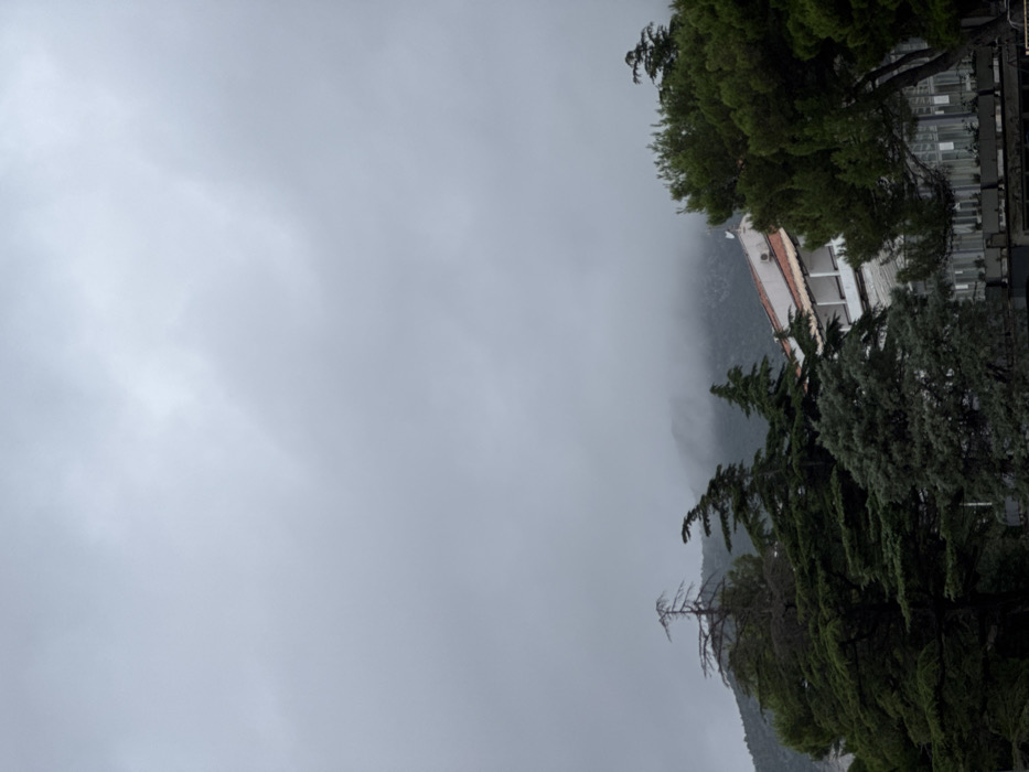 The image displays an overcast day in Rafailovići, Montenegro. Approximately the upper 60% of the frame is occupied by a dense, light grey cloud cover. Below the clouds, a mountain range is visible in the background, with its upper slopes partially obscured by fog or low-hanging clouds. The mid-ground and foreground feature a significant presence of dark green coniferous trees, including taller specimens with distinct shapes. On the right side, a multi-story building with a light-colored facade and a reddish-orange tiled roof is partially visible amidst the trees. The building includes an upper balcony or terrace area with supporting pillars and multiple windows on its lower visible floors, some equipped with planter boxes. A small white satellite dish is affixed to the roofline. No people, animals, or dynamic actions are depicted.