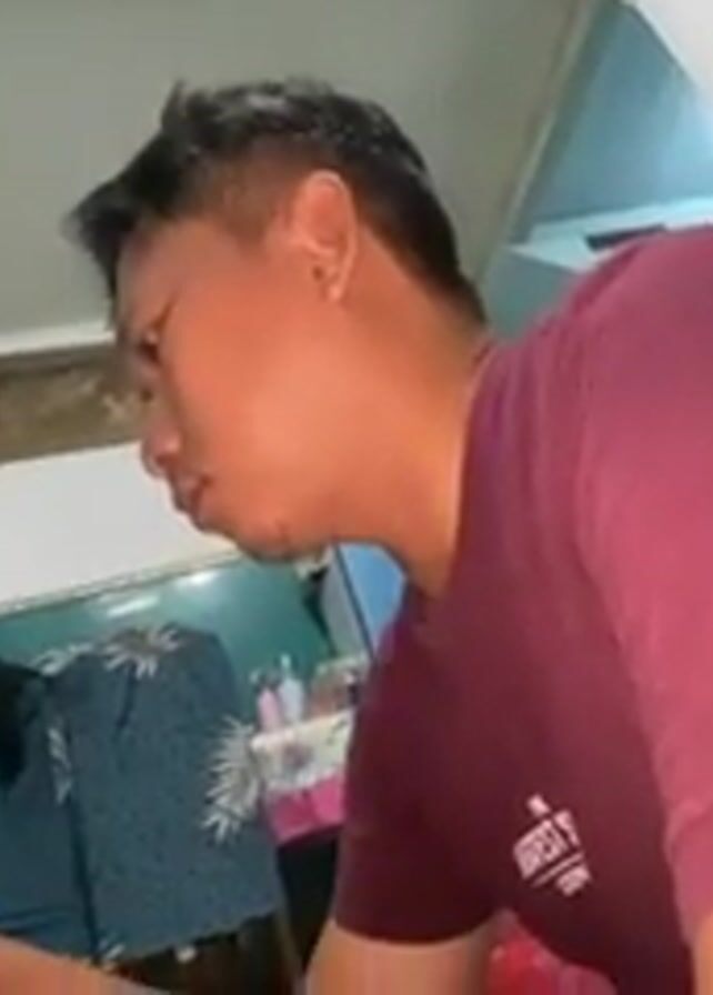 A man is adjusting a black phone holder on a flexible gooseneck stand. He is wearing a maroon t-shirt with an emblem and khaki pants. He is sitting on a mattress on the floor. The walls of the room are white near the ceiling and green closer to the floor. There is a patterned blue shirt hanging on a chair in the background, as well as a small table with a patterned tablecloth.