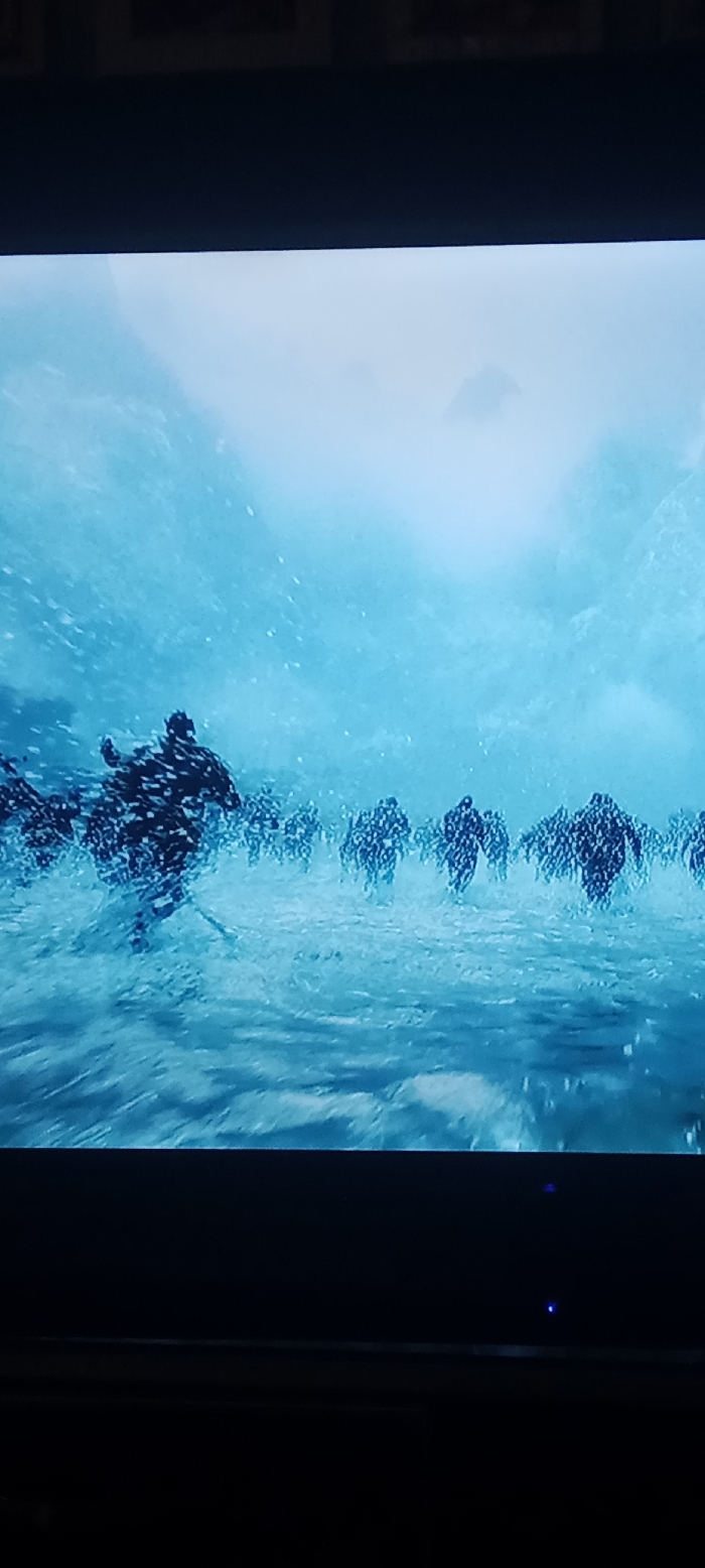 The image is a photograph of a display screen, framed by dark bezels visible at the top and bottom. The screen displays a dynamic outdoor scene characterized by cool blue and white tones, suggesting a cold, possibly wintry or glacial environment. In the foreground and midground, a dense group of numerous dark, silhouetted humanoid figures are visible. These figures are in motion, appearing to run or charge forward through a turbulent medium, possibly water, snow, or ice, as indicated by splashes and particles scattered around them. Individual features of the figures are not discernible due to their silhouette nature. The background consists of large, indistinct landforms, likely mountains, partially obscured by mist, haze, or snowfall. Small, bright particles are suspended in the air across the scene, consistent with snow, ice, or water spray. The environment depicted on the screen, with its features of snow, ice, and mountainous terrain, does not correspond to any geographical location within Abuja, Nigeria. The image itself provides no visual information to ascertain the specific location within Abuja where this photograph of the screen was captured.