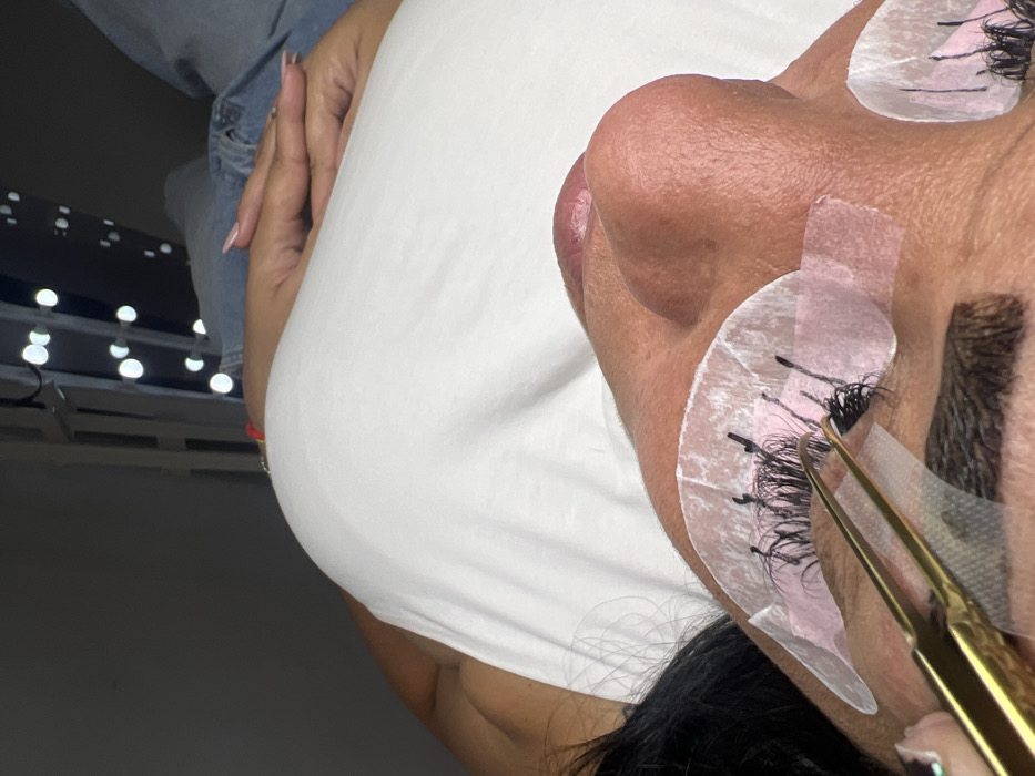 A close-up perspective shows a person with closed eyes receiving eyelash extensions