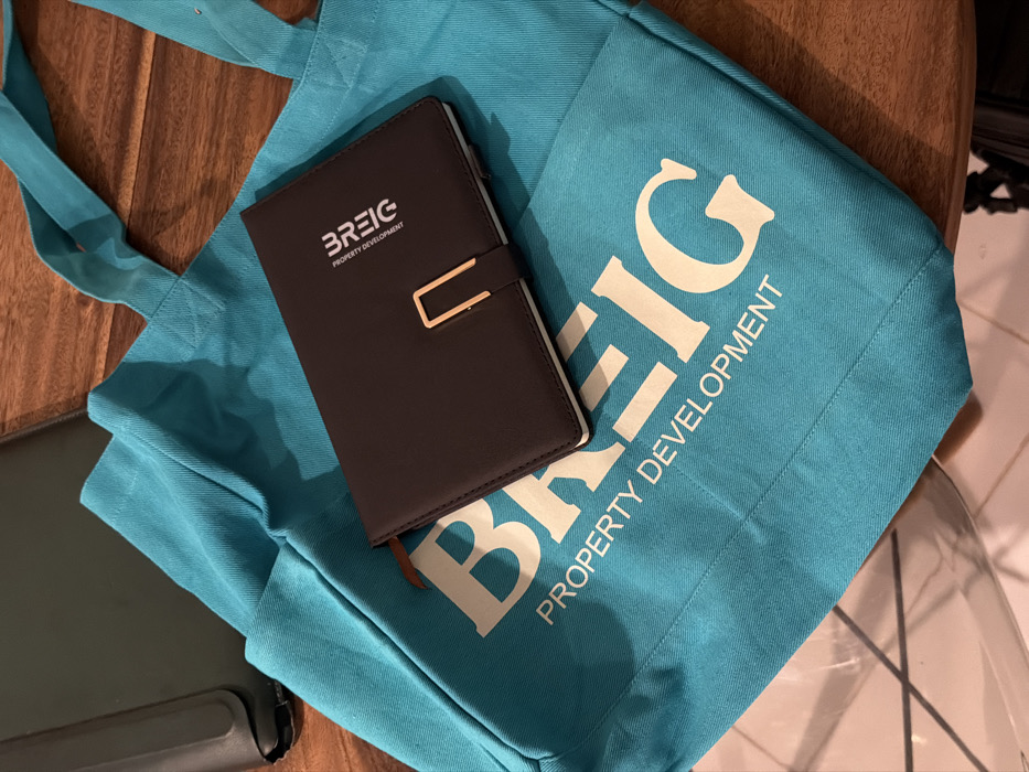 A blue tote bag with the word "BREIG" in white capital letters and "PROPERTY DEVELOPMENT" underneath is partially visible