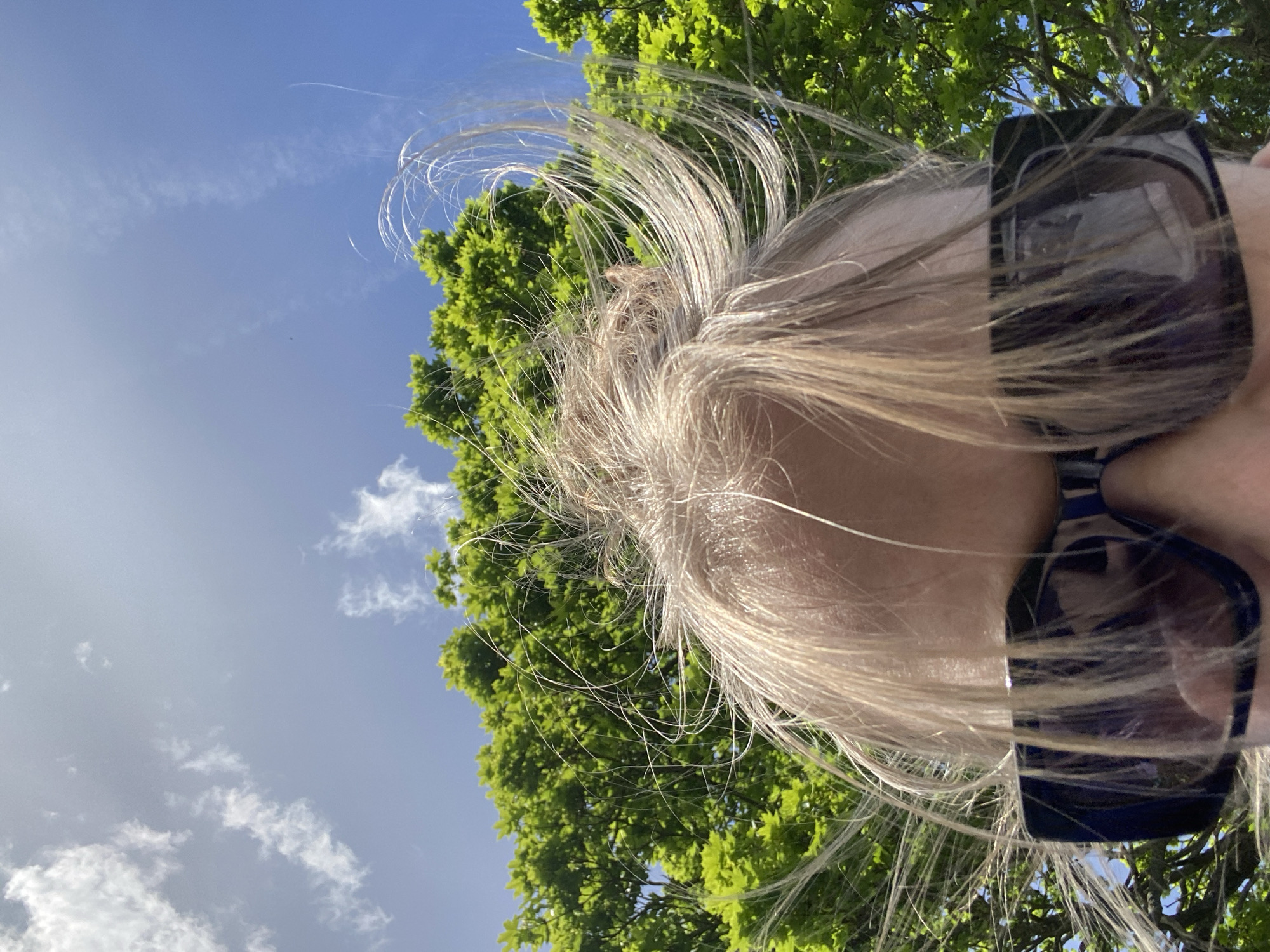 A low-angle, close-up shot shows a person wearing sunglasses against a backdrop of green foliage and a blue sky with wispy clouds. The person has blonde hair, with strands catching the sunlight. The sunglasses have dark lenses and a blue frame. The green foliage appears to be a tree canopy. The sky is a clear blue with some scattered white clouds. The location in the city of London, United Kingdom, is not identifiable from the image.