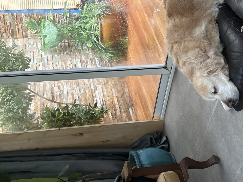 This image captures an indoor-outdoor residential scene in Barcelona, Spain. In the foreground, a light-colored Golden Retriever dog lies asleep on a dark, possibly leather, cushion, with its head resting on the cushion and eyes closed. The interior floor is composed of light grey square tiles. To the left, a partial view of a wooden furniture leg with a yellowish upholstered seat is visible, alongside a teal ceramic pot partially obscured by a dark grey curtain. A light-colored plywood board stands vertically, positioned between the curtain and a glass sliding door frame. The midground features a white-framed glass sliding door, which appears wet, indicating recent rain or precipitation. Beyond the glass door, an outdoor patio with wet, light brown wooden decking is visible. The background consists of a stone wall constructed from irregular, stacked stones in various shades of brown and grey. To the left, a leafy green tree or shrub is visible behind the glass. To the right, a large terracotta-colored pot contains an assortment of lush green plants, including a prominent large-leafed plant resembling an elephant ear and other grass-like foliage.