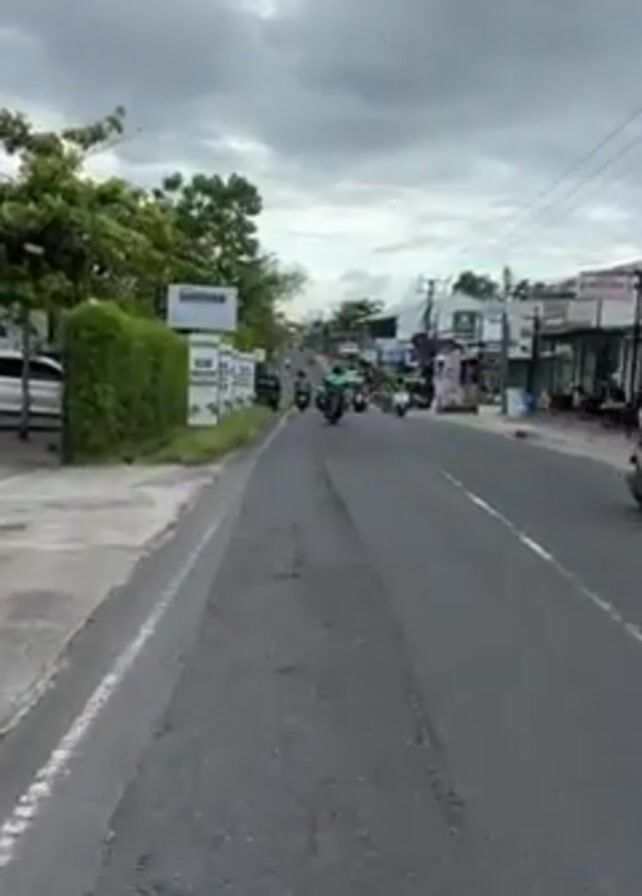 The video depicts a street scene under a cloudy sky. The road is gray asphalt with a white line marking the edge. Several individuals are driving motorbikes in both directions. On the left side of the road, there are green trees and a white sign with the word "Bamboo" visible. The sign also has the words "NOW OPEN," with the words "Breakfast" and "Lunch" below. On the right side of the road are buildings with businesses. A person on a black motorbike with a white shirt and backpack is driving toward the camera.