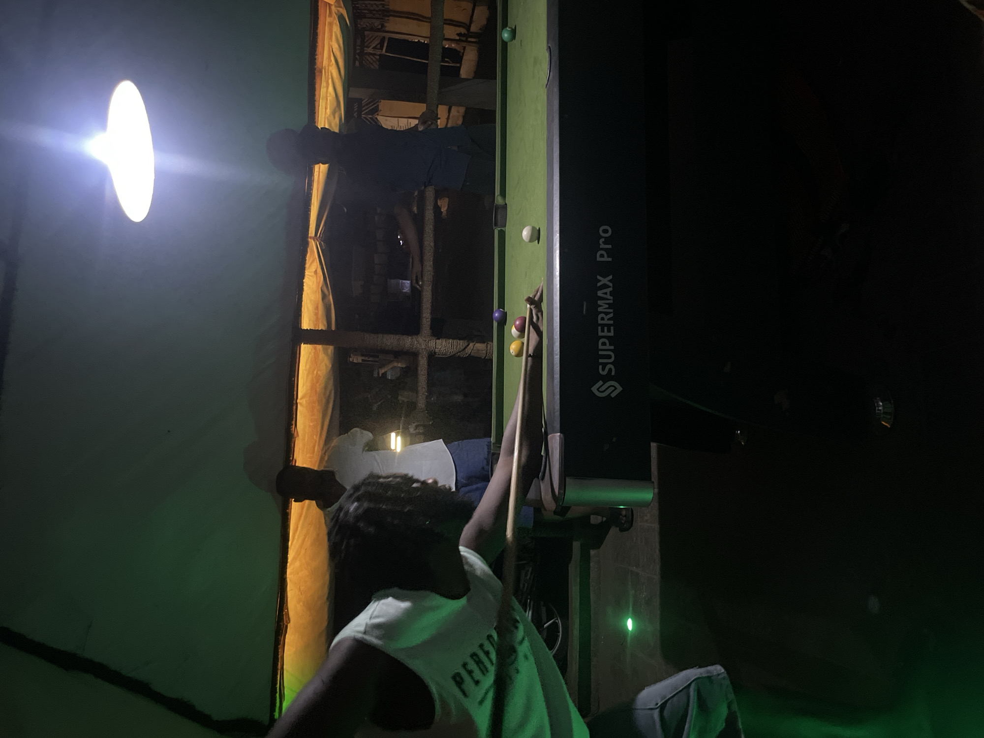 The image depicts an indoor or semi-enclosed game area in an unknown city and location, illuminated under what appears to be a large tent-like structure. Three adult males are present around a "SUPERMAX Pro" brand pool table with a green felt surface. In the immediate foreground, a dark-skinned male with dreadlocks, wearing a light-colored sleeveless shirt, is leaning over the table, holding a wooden cue stick, and preparing to strike the white cue ball. Nearby balls include yellow, red, purple, and green solids, with a brown cue chalk resting on the table's edge. Behind the player, a second dark-skinned male, wearing a white short-sleeved shirt and blue shorts, stands observing the game. Further in the background, a third dark-skinned male, largely obscured by shadow and wearing dark clothing, also observes the scene. The area is primarily lit by a bright, disc-shaped overhead lamp, casting significant illumination downwards. Green accent lighting is visible on the floor and reflecting off the side of the pool table. The ceiling consists of a dark green fabric canopy, with a lighter brown/yellow fabric visible beneath it in the background. The structure is supported by visible wooden poles, and the floor appears to be tiled.