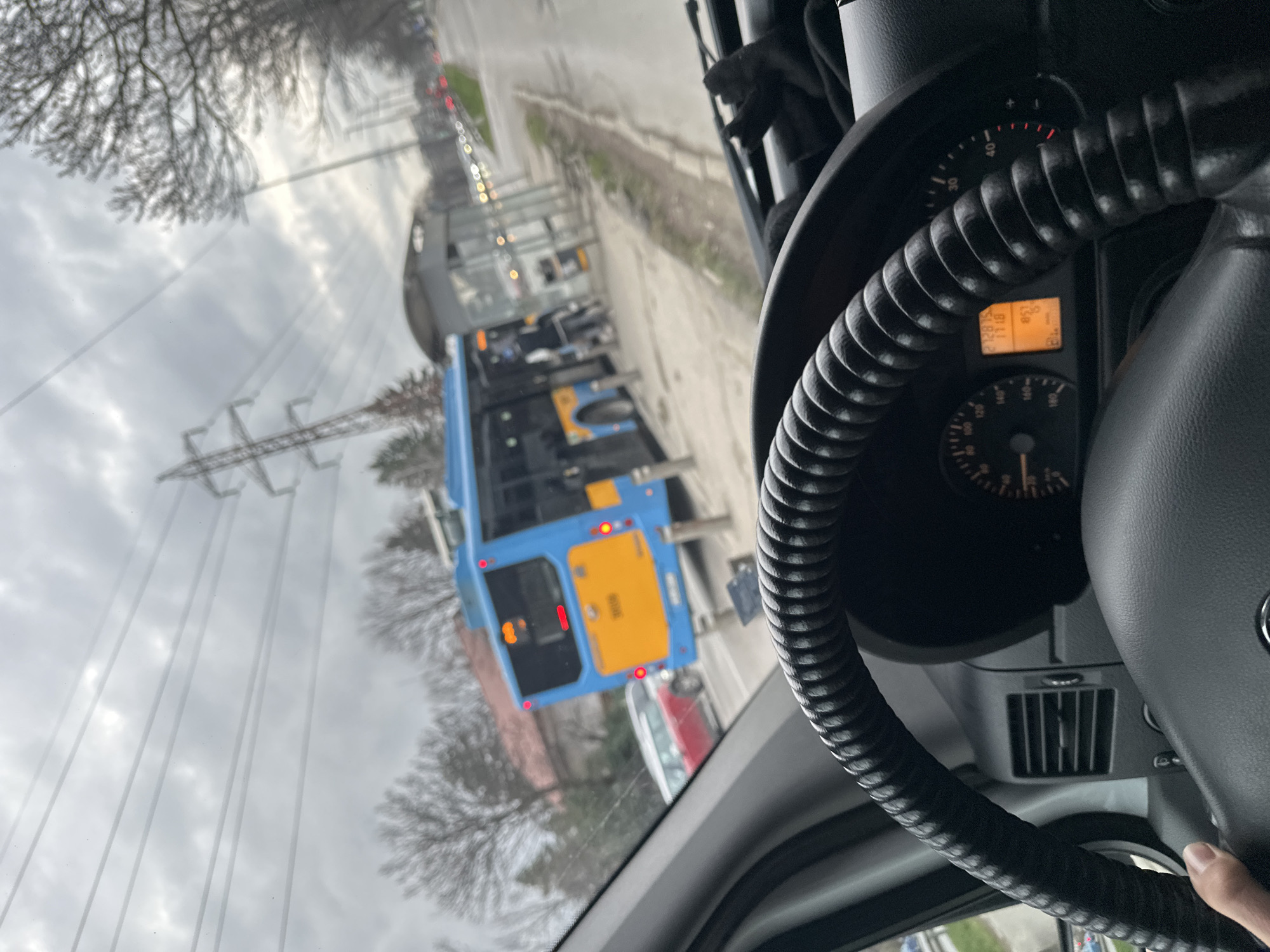 A driver is behind the steering wheel of a vehicle, likely a van or truck, stopped in traffic on a street in Sofia, Bulgaria. Visible through the windshield are a blue and yellow public bus directly ahead, followed by a white transport truck and several other vehicles stopped in a line. To the left of the road are utility poles and bare trees. The weather appears overcast. The vehicle's dashboard and part of the steering wheel are in the foreground.