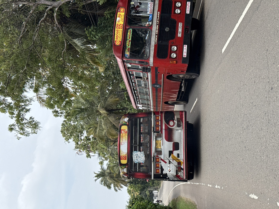 two red buses on a road. The front bus, a Lanka Ashok Leyland, has the registration number NB-8144 and serves the Kataragama-Galle route (32). The second bus has the registration number ND-1847, and the number 32 is seen on its front, along with “Kataragama”. The bus includes the number 1955. Foliage surrounds the buses.