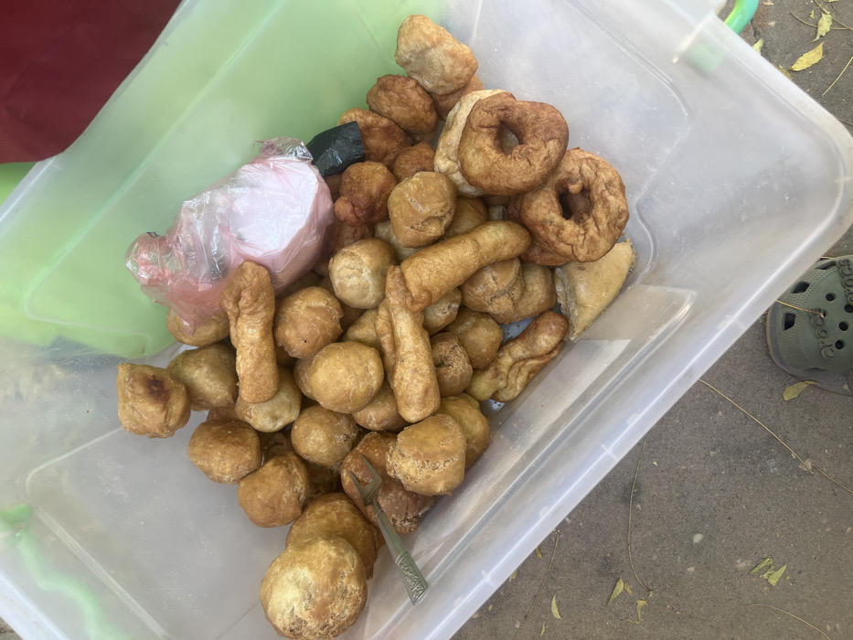 The scene depicts a transparent plastic storage container positioned outdoors on a grey, textured ground surface in Birnin Kebbi, Nigeria. The container is largely filled with a dense assortment of deep-fried pastries. These include numerous golden-brown, irregularly spherical items, multiple elongated, finger-like pieces, and at least two dark golden-brown, ring-shaped pastries with central holes. A small, silver-colored, two-pronged serving fork is partially embedded among the pastries on the left side. Towards the upper right of the container, a clear plastic bag contains a quantity of pink, granular or powdered substance, presumably sugar or a condiment. A small, dark, irregular object is also visible adjacent to the pink bag. A portion of a light green container is visible directly behind the primary container. The ground beneath the container is rough, with scattered dry leaves and small debris. A human left foot, clad in a dark green Crocs sandal, is visible in the lower left foreground. No overt human actions or interactions are in progress within the frame, beyond the presentation of the food items.