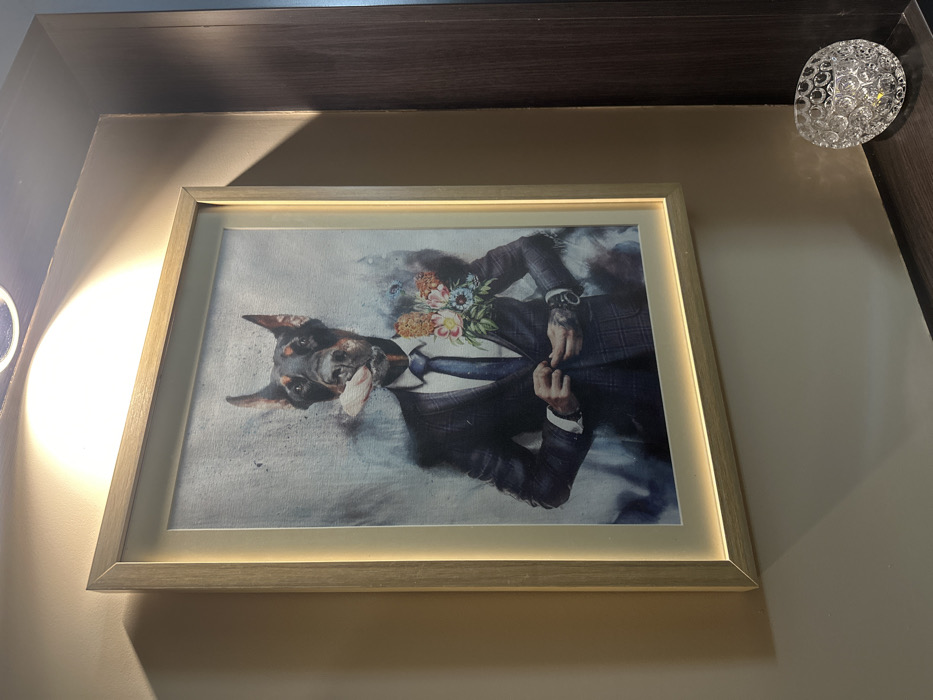 A framed artwork is centrally featured, mounted on a light beige wall in an indoor setting. The artwork depicts a Doberman Pinscher's head superimposed onto a human male torso dressed in a dark blue plaid suit with a white shirt and blue tie. The Doberman's mouth is open, revealing a cigar held between its teeth, with a portion of its tongue visible. The human figure's right hand, showing tattoos on the wrist and fingers, is adjusting the lapel of the suit jacket. A bouquet of flowers, including orange-brown banksias and pink and white blossoms with green foliage, is tucked into the left lapel area of the suit. A dark wristwatch is visible on the left wrist. The background of the artwork is a textured light blue-grey, with darker blue-grey abstract brushstrokes around the figure. The artwork is enclosed in a rectangular frame with a double-layered design: an inner thin light gold/brass-colored trim and an outer thicker gold/brass-colored frame. An integrated light strip illuminates the artwork from within the frame, casting a warm glow on the image and the immediate wall area. Above the frame, a recessed light fixture with a silver bezel is visible on the ceiling, emitting a bright yellow-white spotlight downwards onto the top-center of the artwork. The wall extends to the right, meeting a darker, possibly wooden, vertical panel or furniture piece. Below the right side of the frame, on a dark, reflective surface, sits a clear, textured decorative object, appearing crystalline or glass-like, with multiple circular indentations. The specific location within Razgrad, Bulgaria, cannot be determined from the visual information presented.