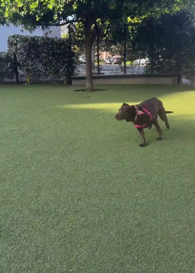 dogs playing in an enclosed dog park with artificial turf. A brown Labrador wearing a pink harness runs from the foreground toward the center of the park. In the background, a woman wearing a green shirt walks by, accompanied by a small dog on a leash. Other dogs, including a tan and white Bulldog, are also present in the park. A man wearing shorts and a blue shirt stands near a hedge and appears to be watching the dogs. A modern glass building is visible in the background.