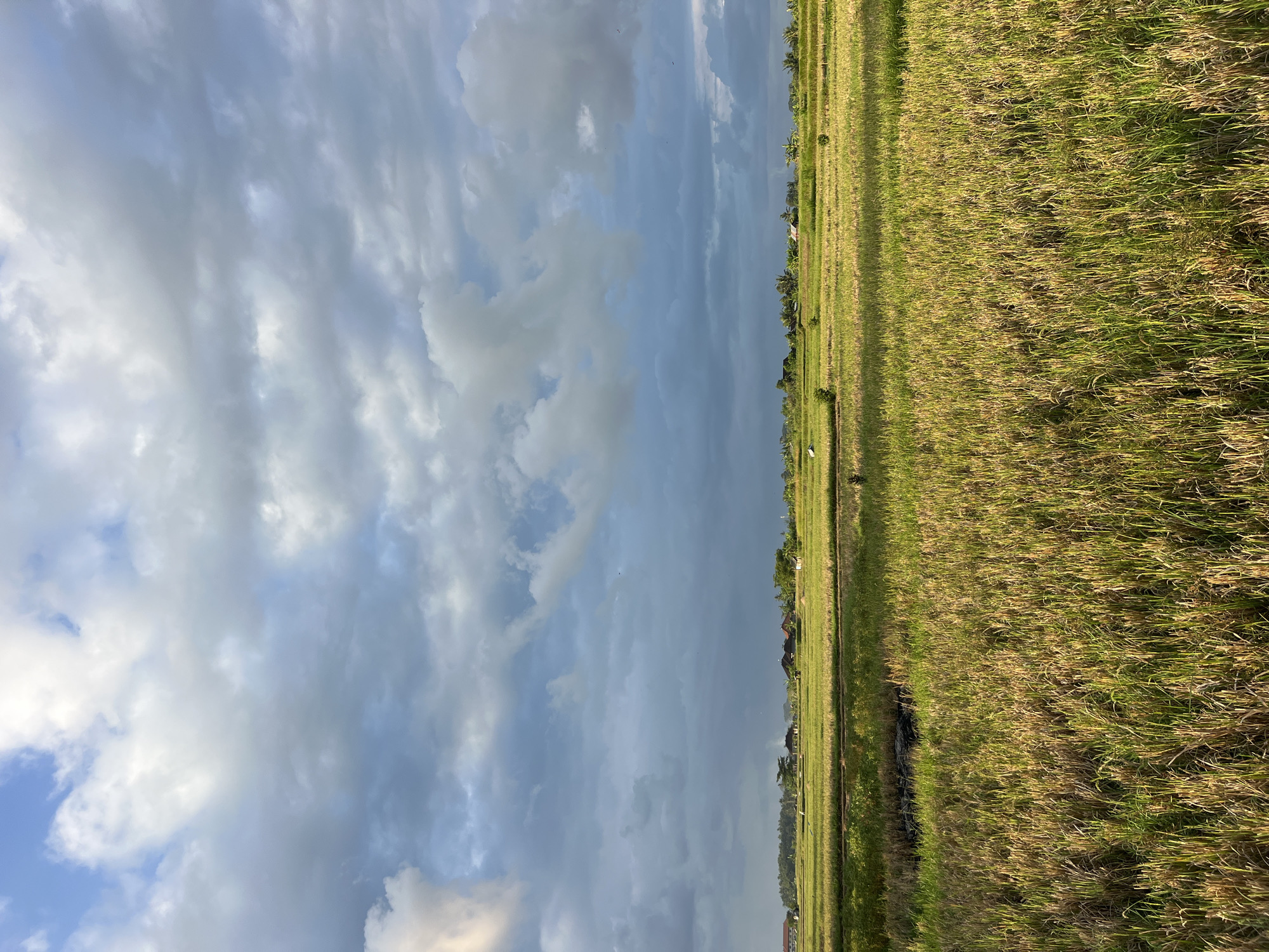 rice field landscape in Abiansemal, Indonesia. The sky is filled with gray and white clouds. The rice field extends into the distance, with a mix of green and golden hues. There are buildings and trees visible along the horizon. The photo is taken from a low angle and rotated 90 degrees counter-clockwise.