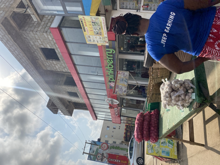 The image depicts an outdoor commercial scene in Ablekuma, Ghana, under a partly cloudy sky with bright sunlight