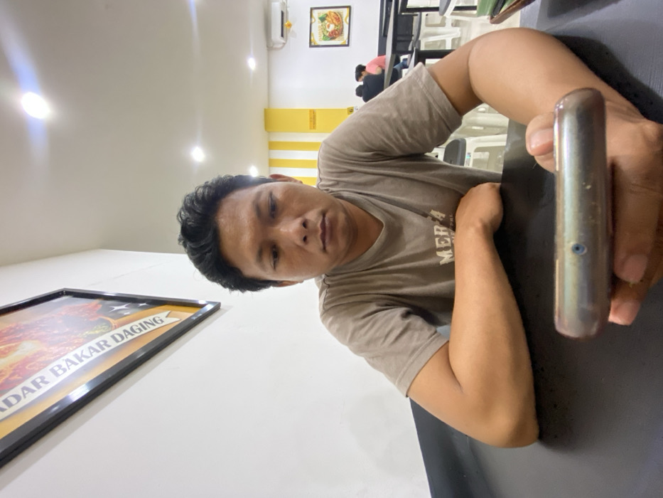 The image depicts an indoor restaurant environment, consistent with commercial establishments found in cities such as Sidoarjo, Indonesia. A man, appearing to be of East Asian descent, with short dark hair and a neutral expression, occupies the center foreground. He wears a short-sleeved, light brown or grey t-shirt with partially legible text across the chest. He is seated at a black tabletop, with his forearms resting on the surface. His left hand is partially visible, holding a metallic-finish smartphone horizontally, with its top edge facing the viewer and a small circular lens visible. His gaze is directed downwards, possibly towards the phone or just below the camera's perspective. The background features white walls. On the left, a framed poster with a black border contains text, partially visible as "BAKAR DAGING" (grilled meat) against an orange or yellow background. The right background includes a section of white wall with vertical yellow and white stripes, an air conditioning unit mounted below a second framed poster depicting a dish of food. In the far background, several blurred figures, including two individuals, are seated at dark tables with white chairs, indicating other patrons. The ceiling is white with multiple recessed circular light fixtures providing illumination. A brown, woven, oblong tray or plate is partially visible on the table in the lower right corner.