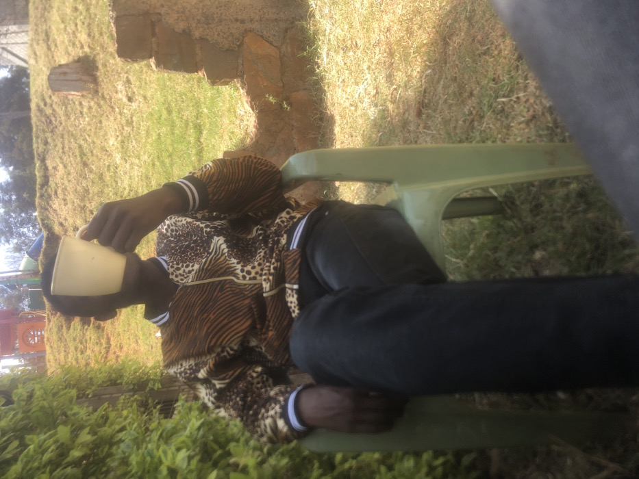 The scene depicts an outdoor setting in Ngong ward, Kenya, featuring one individual. A person with dark skin is seated in a light green plastic chair, wearing a brown, black, and white animal-print bomber jacket and dark trousers. The individual holds a light-colored mug to their face with the right hand, obscuring identification. The left arm rests on the chair's armrest, and legs are crossed. The immediate environment consists of a grassy area with both dry, light brown sections and greener patches. Dense green foliage occupies the left side of the frame. In the background, a grassy slope ascends, topped by a red and blue children's play structure. A low, partially crumbled wall made of reddish-brown bricks and stones is visible on the right side of the slope, with a tree stump further back. The scene is illuminated by natural daylight.