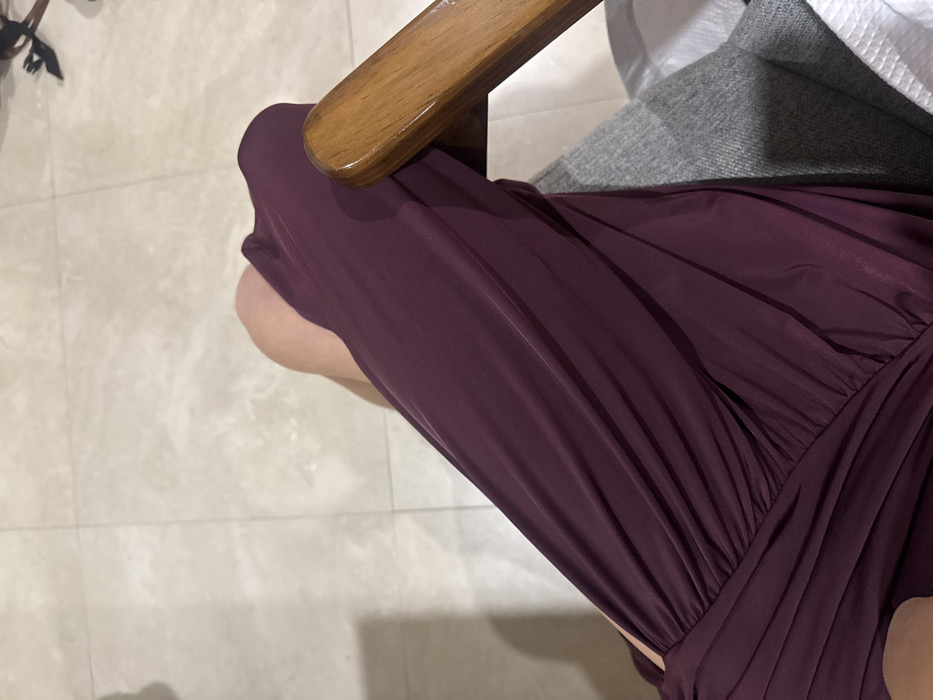 A top-down shot reveals a seated person wearing a flowing, wine-colored dress
