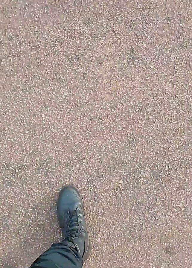 A person wearing black boots and black pants is walking on a rough, textured, brown and tan surface. The camera is pointed down at the person's feet as they move. A buzzing sound can be heard.