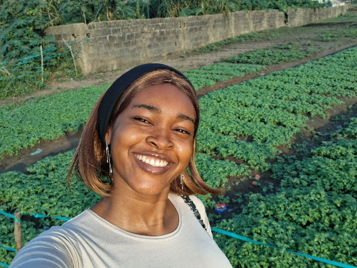 A smiling woman with a black headband and shoulder-length brown hair poses for a selfie. She's wearing a light-colored top and long earrings. Behind her, a field of green, leafy plants stretches into the distance, arranged in rows. A grey brick wall borders the back of the field, adding a structural element to the natural scene. The lighting is bright, highlighting the woman's features and the vibrant green of the plants.