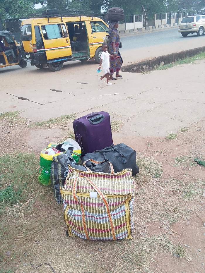 A collection of luggage sits on the ground: a large checkered bag, a purple suitcase, and several other bags. In the background, a yellow bus has its door open, and a woman with luggage on her head walks alongside a child in a white outfit. A car is visible on the road, with some buildings in the far background. A three-wheeled vehicle is partially visible near the bus.