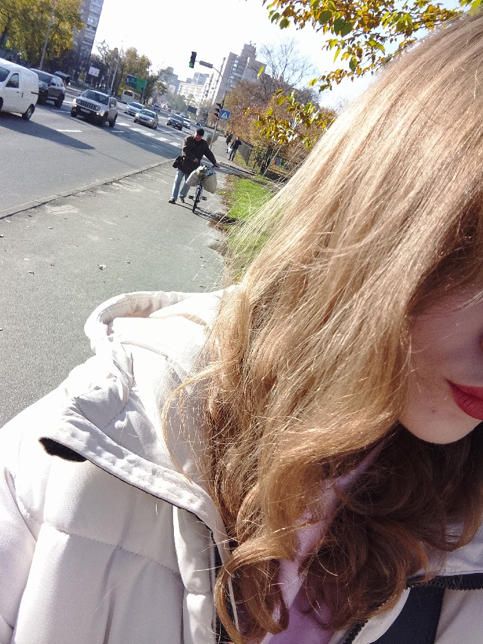 A forensic description of the scene reveals an urban environment on a clear, sunny day, likely during autumn due to the foliage. **Location:** The scene is located on Peremohy Avenue (Проспект Перемоги), Kyiv, Ukraine, a wide thoroughfare with multi-story buildings lining the street. **Foreground:** The image is taken from a first-person perspective, showing a portion of a person's upper body. Long, wavy, light brown hair dominates the right side of the frame. The lower left side of a face is visible, featuring red lipstick. The individual wears a light-colored (possibly off-white or cream) quilted puffer jacket over a light purple garment. **Midground:** To the left and center, a multi-lane asphalt road is visible, populated by various vehicles including a white van, a silver SUV, and several other cars. A traffic light showing a green signal is present on the right side of the road, along with a blue pedestrian crossing sign. An asphalt sidewalk runs parallel to the road. A male individual, dressed in a dark jacket and blue jeans, is pushing a dark-framed bicycle with a light-colored bag attached to the handlebars, walking on the sidewalk away from the viewer. **Background:** In the distance, several multi-story buildings, characteristic of urban residential or commercial architecture, rise above the tree line. Trees with yellow and orange autumn leaves are scattered along the sidewalk and in the background, indicating the season. The sky is bright and clear, and strong sunlight casts visible shadows.
