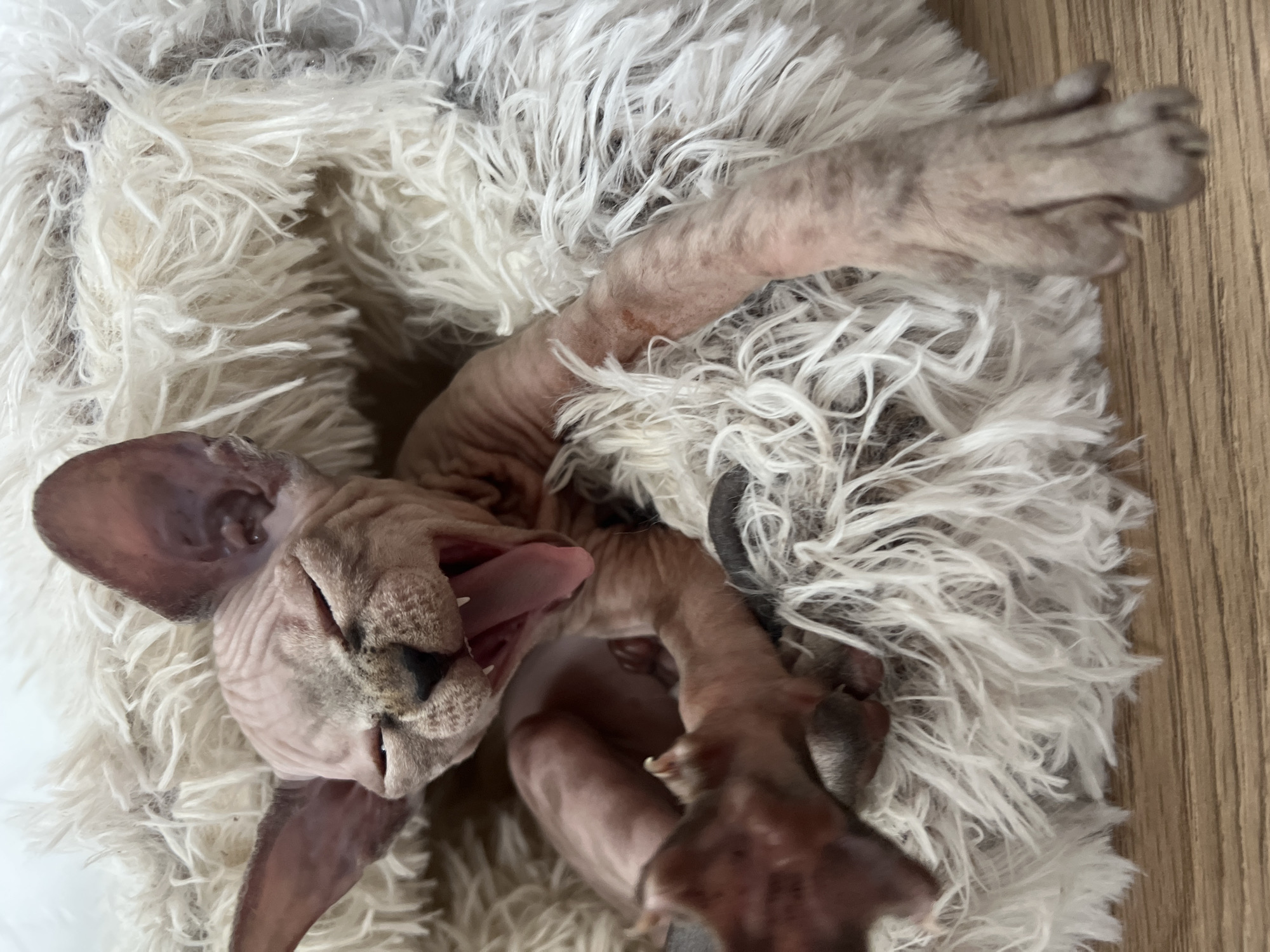A hairless cat is lying upside down on a white, fluffy rug