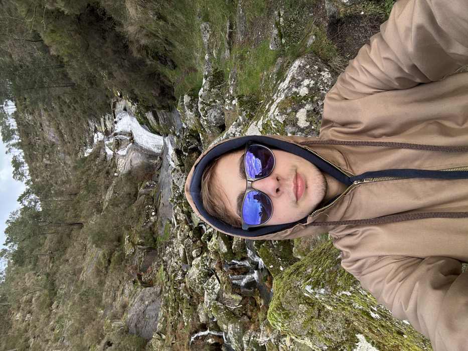 A person in a brown hooded jacket and sunglasses takes a selfie outdoors. A waterfall cascades down rocks in the background, surrounded by trees and mossy stones. The sunglasses reflect the sky and trees. The zipper on the jacket is partially open, revealing a navy blue interior. The scene suggests a natural, possibly mountainous, environment.