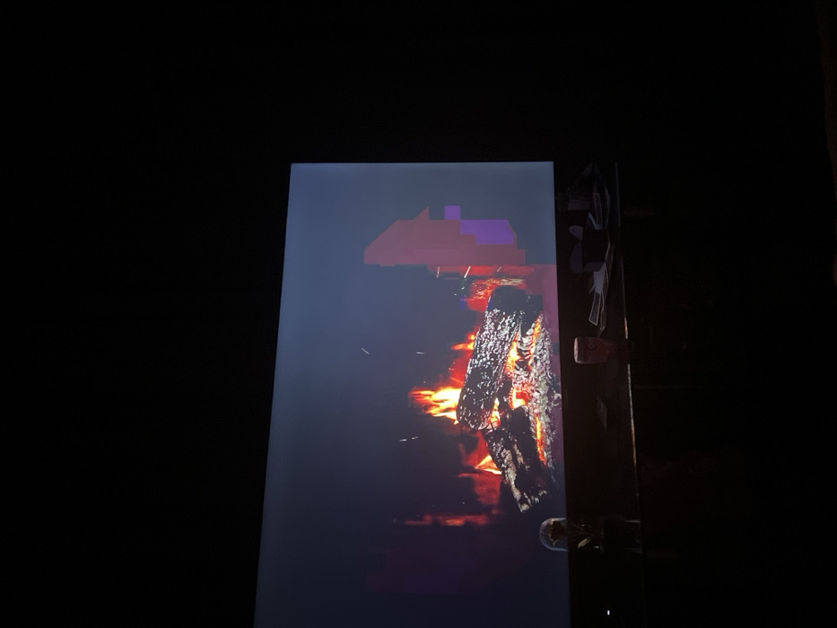 The image depicts an indoor scene in a predominantly dark environment, illuminated primarily by a large, rectangular screen. The screen displays a video of a burning fireplace, featuring multiple logs engulfed in vibrant orange and red flames, with embers glowing beneath. Small white sparks are visible within the flame area. The right side of the screen exhibits significant digital artifacting, appearing as a blocky, pixelated, magenta and purple abstract shape. Below the screen, a dark surface holds several objects: a clear bell jar containing a single red rose on the left, a reddish-brown cup with visible text or a design towards the center, and scattered papers and a dark box-like object to the right. No individuals are present, and no actions or interactions are discernible. The specific location within the city of Kribul, Bulgaria, cannot be determined from the visual evidence provided.