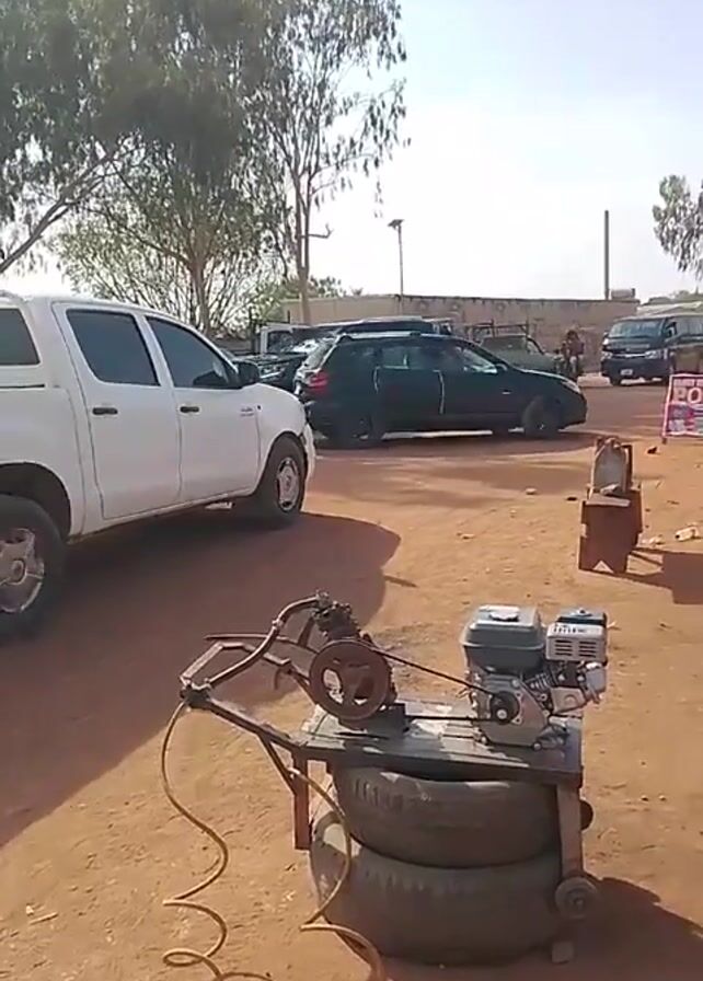 The scene appears to be in an outdoor auto repair area with several vehicles parked on a dusty ground. The camera is static, focused on a portable air compressor built on a frame atop used tires. The compressor has a small gasoline engine powering it, and a yellow air hose is visible. In the background, a white Toyota Hilux pickup truck and a black Toyota Land Cruiser Prado are parked. Other vehicles are also visible further back. There are also trees and a fence. The sky is bright and sunny, indicating daytime.
