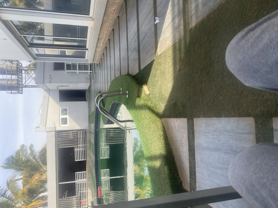 The image displays an outdoor area in Lafia, Nigeria, featuring a swimming pool and surrounding architectural structures, viewed from a low perspective. In the immediate foreground, the lower legs of an individual, dressed in grey sweatpants, are visible. The ground beneath consists of square light grey paving stones interspersed with dark green artificial turf. A rectangular swimming pool, containing greenish-blue water, occupies the left midground. Silver-colored metallic handrails for pool entry are positioned on the pool's edge. A red and white buoyancy aid is visible floating in the pool. The pool is bordered by a raised, curved section covered in artificial turf. A paved walkway, composed of light grey rectangular stones set within artificial turf, extends from the right side of the pool towards the background. A small piece of white refuse rests on one of these paving stones. In the background, multiple light grey buildings are present under a clear sky. A structure on the left exhibits an open-sided area with white horizontal railings and dark vertical coverings. A central building displays a dark doorway and two white-framed windows, with a white, multi-tiered shelving unit positioned outside its right entrance. To the far right, a building facade with large reflective windows is visible. Elevated on a metallic framework atop a background building, two dark cylindrical water tanks are mounted. Palm trees are visible in the upper left background. The scene is illuminated by direct sunlight, casting shadows consistent with morning or late afternoon conditions.