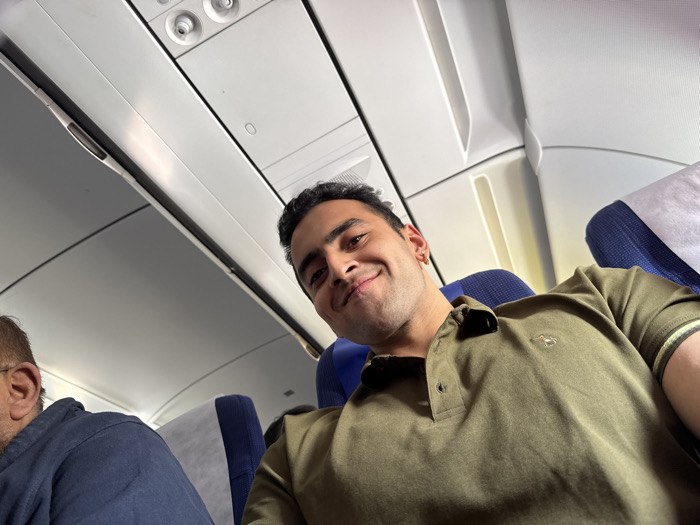 The image depicts the interior of an airplane cabin, with two male passengers visible, located within the city of Jaipur Municipal Corporation, India. A young adult male, the primary subject, is positioned centrally, slightly to the right, looking directly at the camera with a smile. He has short, dark hair and is wearing an olive-green short-sleeved polo shirt featuring a small, light-colored embroidered animal motif on the left chest. A gold hoop earring is visible in his left ear. He occupies a blue aircraft passenger seat with a white headrest cover. To the left and slightly forward, the upper back and right shoulder of a second male are visible. This individual has short, lighter-colored hair and is dressed in a dark blue long-sleeved shirt or sweatshirt, seated in an adjacent aircraft seat. His face is not discernible. The background shows the typical interior structure of an aircraft cabin, including white overhead panels, integrated lighting, and air vents. The cabin appears brightly lit by ambient light. No discernible interactions occur between the two visible individuals.