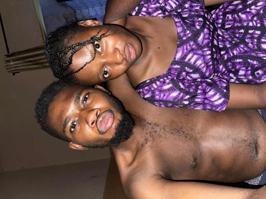 A close-up captures two individuals. A woman, adorned in a purple and black patterned dress and delicate necklace, is above. The man, shirtless with a beard, is below. Both are looking at the camera with their heads close together. The lighting casts shadows, and the background is plain.