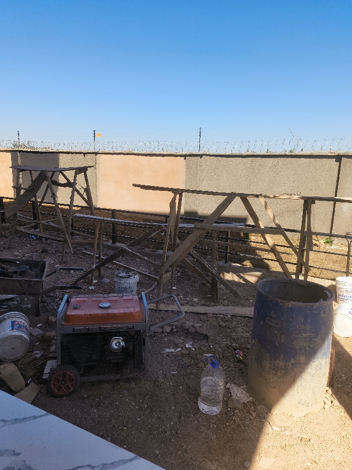 The scene depicts an outdoor work site in Bar Gada, Nigeria, under a clear blue sky. The ground consists of reddish-brown dirt with scattered construction debris. In the midground, multiple wooden A-frame trestles support horizontal wooden planks, appearing as temporary scaffolding. A portable orange and black generator on wheels is positioned in the foreground, left of center. To its immediate left, an overturned white plastic bucket with partial blue lettering and a metal wheelbarrow containing dark objects are partially visible. Behind the generator, a paint-splattered white plastic bucket is present. To the right of the generator, a large, upright, weathered dark blue plastic barrel stands, with a clear plastic water bottle with a blue cap positioned on the ground in front of it. Another white plastic bucket is located behind the barrel. The background features a concrete block wall, segmented into light orange and grey sections, topped with a fence incorporating barbed wire. A distant orange marker is visible on a fence post. No persons are observed.