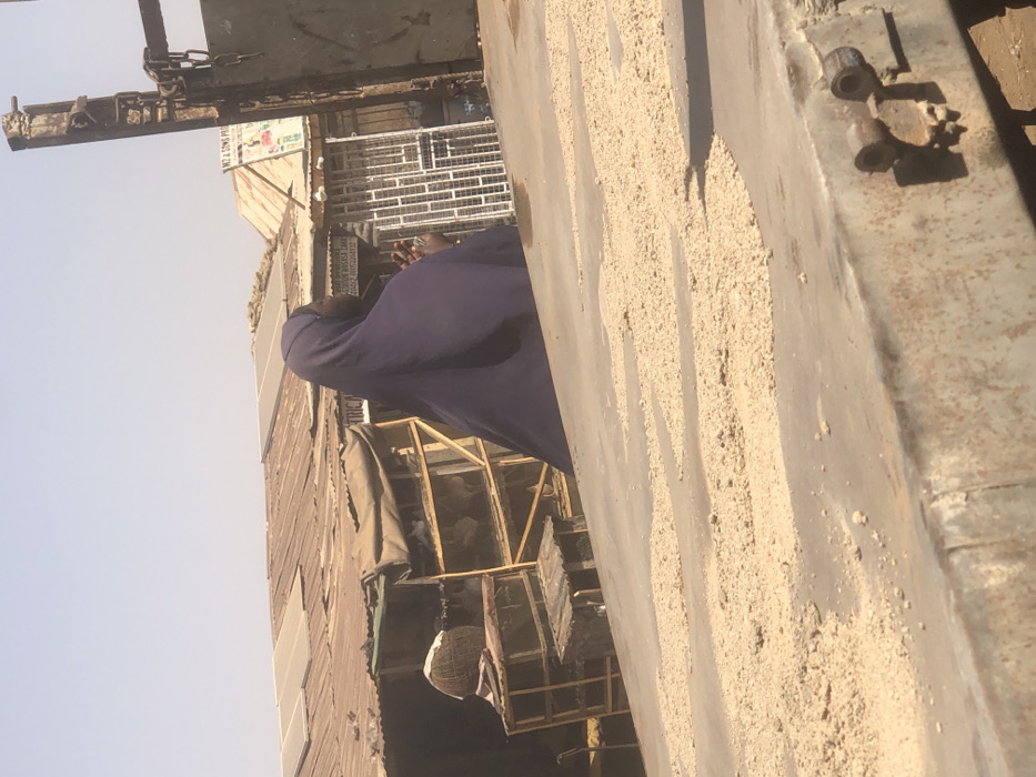 The image captures an outdoor scene in Tukur Tukur, Nigeria, under bright daylight. In the foreground, a flat, weathered metal surface, likely the bed of a vehicle, displays several parallel rows of light-colored, granular material. Positioned behind this surface, a person clad in a dark blue head covering and garment is partially visible, facing away from the camera. Their hands are raised and in front of them, executing an unspecified gesture. In the midground, a multi-tiered wooden structure with wire mesh enclosures, consistent with a market stall for poultry, contains visible chickens. Adjacent to this, a smaller, rustic structure and a round, woven cage are present. The background features several single-story commercial buildings with corrugated metal roofs, upon which multiple solar panels are installed. Partial signage on these buildings includes text such as "M Z & SONS PROD" and "ELECTRICAL," along with numerical sequences. The environment appears dusty and arid.