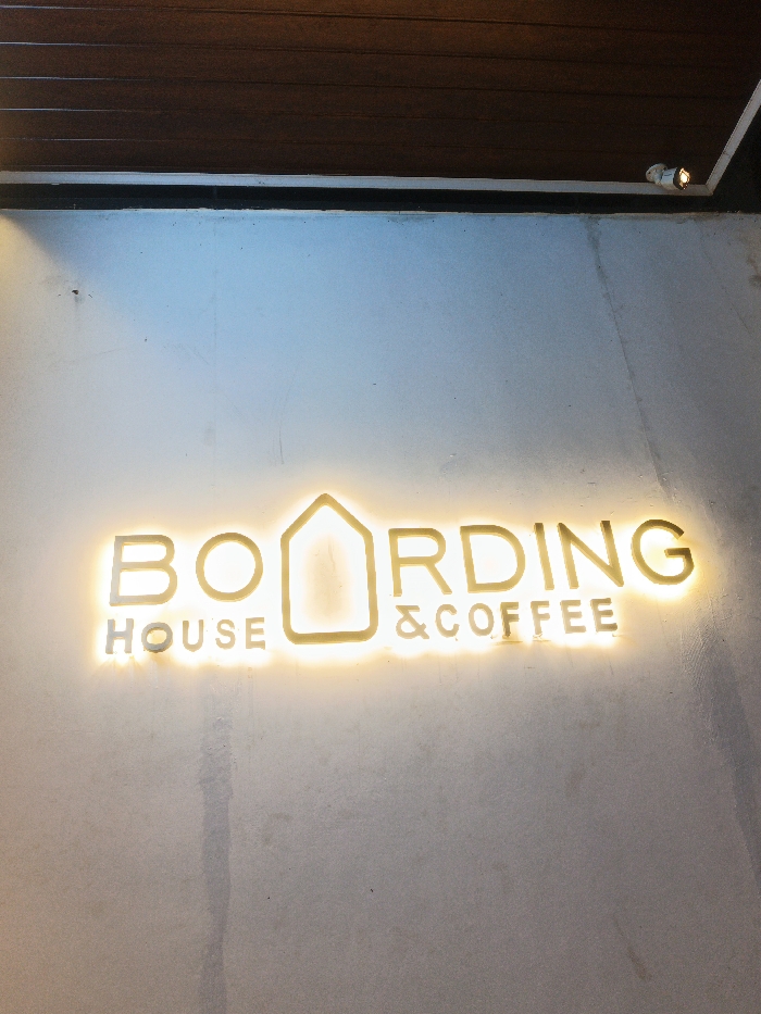 A glowing sign on a light-colored wall reads "BOARDING HOUSE & COFFEE