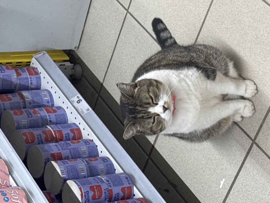 - "The image depicts a domestic short-haired cat sitting on a tiled floor in a supermarket aisle in Rostov-on-Don, Russia" by FM-fCTdw1, licensed under CC BY 4.0