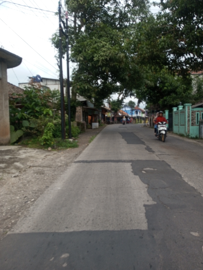 The image depicts a street scene in Khajuripada, India, under an overcast sky. A paved road, characterized by numerous dark asphalt repair patches, extends into the background. To the left, a dirt and gravel shoulder adjoins the road, featuring a partially visible concrete structure, dense green vegetation, and multiple dark utility poles. Various single-story buildings are situated behind the foliage. On the right side of the road, a person wearing a red shirt drives a white and red scooter, carrying a passenger, traveling away from the camera. A teal-colored fence or wall lines the immediate right side of the street. In the mid-ground, large green trees form a natural arch over the road. Further in the distance, additional buildings with varying colors, including blue, are visible along the street, alongside other indistinct vehicles. The environment is consistent with a semi-urban or residential thoroughfare.