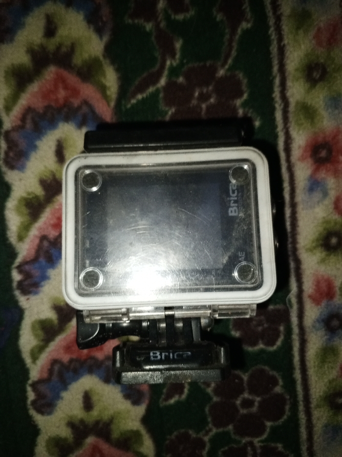 A compact, encased action camera rests against a floral patterned surface. The camera, branded "Brica", features a clear protective case with visible screws at the corners. Beneath the camera body is a mounting bracket, also branded "Brica", secured to the case. Scratches are visible on the screen and the protective case of the camera.