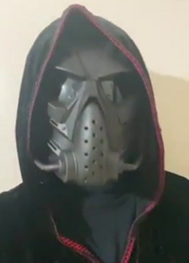 - "A person wearing a black hooded sweatshirt with red trim is also wearing a black mask with holes and other attachments" by FM-HlXDJ3, licensed under CC BY 4.0