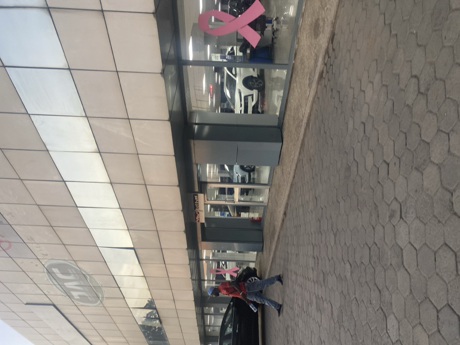 storefront in Weija, Ghana. The storefront has large windows and is made of concrete. There are three vehicles visible in the windows. The building is decorated with a pink ribbon. A man walks on the sidewalk in front of the storefront. The sidewalk is made of hexagonal pavers. The man wears a blue turban and a red shirt. He carries a blue water bottle in his left hand.