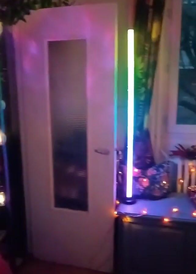 room decorated for Christmas. There is a closed white door with a frosted glass window in the center. Beside the door is an LED light stick emitting pink, green, and blue light. Next to the light stick is a window with dark curtains and a view of tree branches outside. In front of the window is a gray storage unit decorated with colorful pillows, strings of lights, and a red gift bag. To the right of the storage unit is a faux tree decorated with yellow leaf-shaped lights, and a pile of wrapped Christmas gifts underneath. The room is dimly lit with various decorative lights, creating a warm and festive atmosphere.