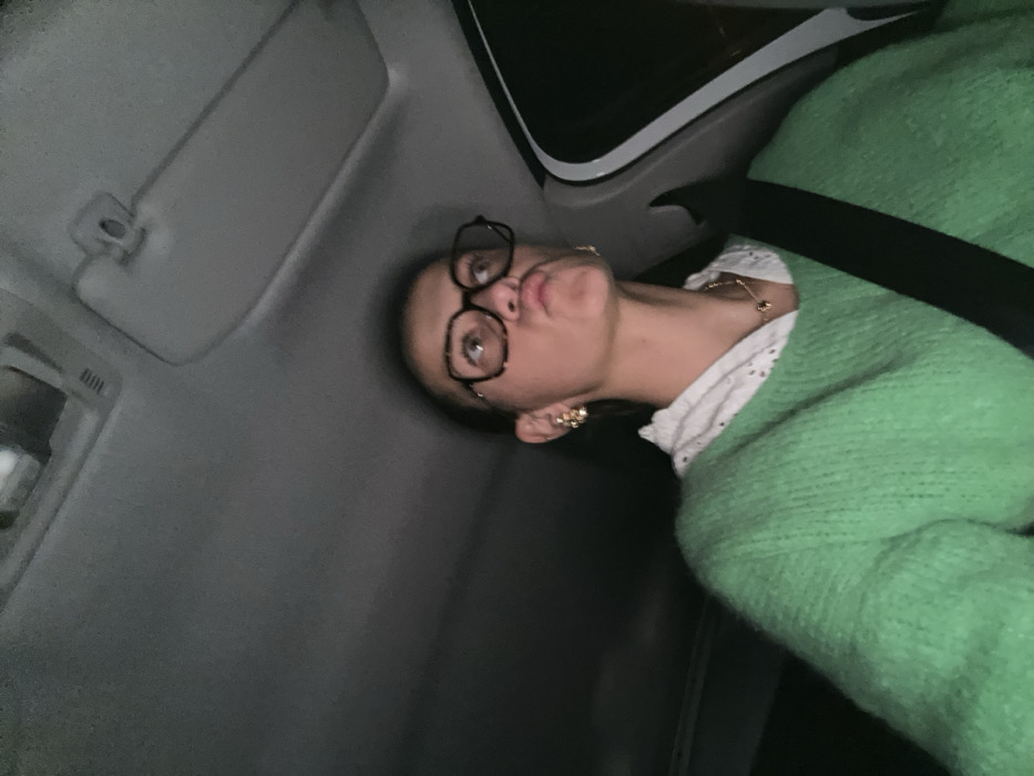 A woman wearing glasses, a white top with lace details, and a green sweater is seated in a car