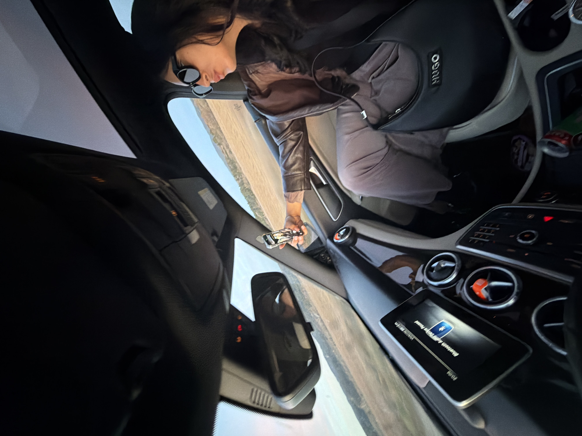 The image is taken from inside a vehicle. A woman wearing sunglasses and a jacket is sitting in the driver's seat. She is holding a mobile phone in her right hand. A black HUGO brand bag is on the passenger seat. The car's dashboard and central console are visible, including the infotainment screen displaying a "Bluetooth Audio Device Found" message. Outside the vehicle, a landscape of dry grassy terrain is visible. The image appears to be taken in an open rural or semi-rural area, but the specific location of Popovyane, Bulgaria cannot be confirmed from the image alone.