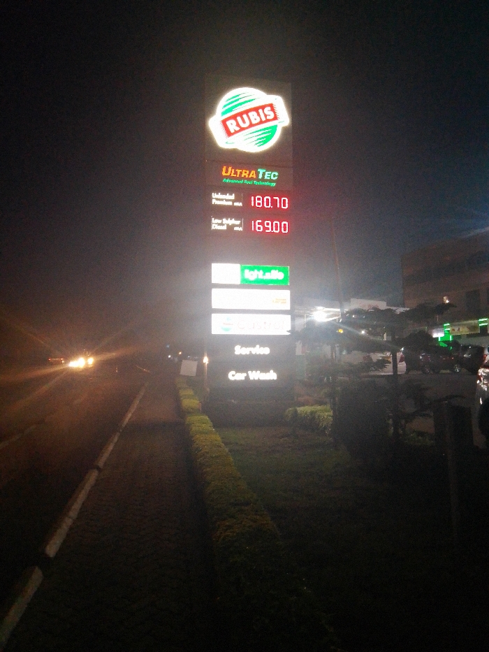 A nighttime shot reveals a Rubis gas station price sign, displaying 'Unleaded Premium' at 180