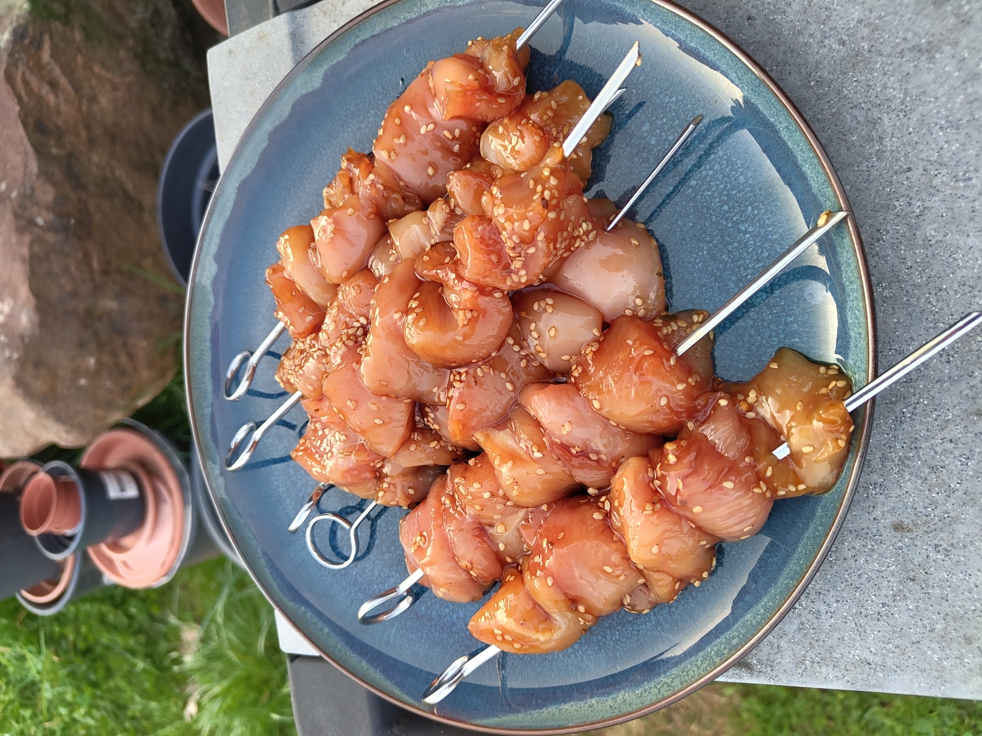 - "Seven metal skewers, each laden with multiple pieces of raw, diced chicken breast coated in a glossy, orange-brown marinade and sprinkled with white sesame seeds, are arranged on a round, blue ceramic plate with a textured finish and a bronze-colored rim" by FM-uXjJw1, licensed under CC BY 4.0