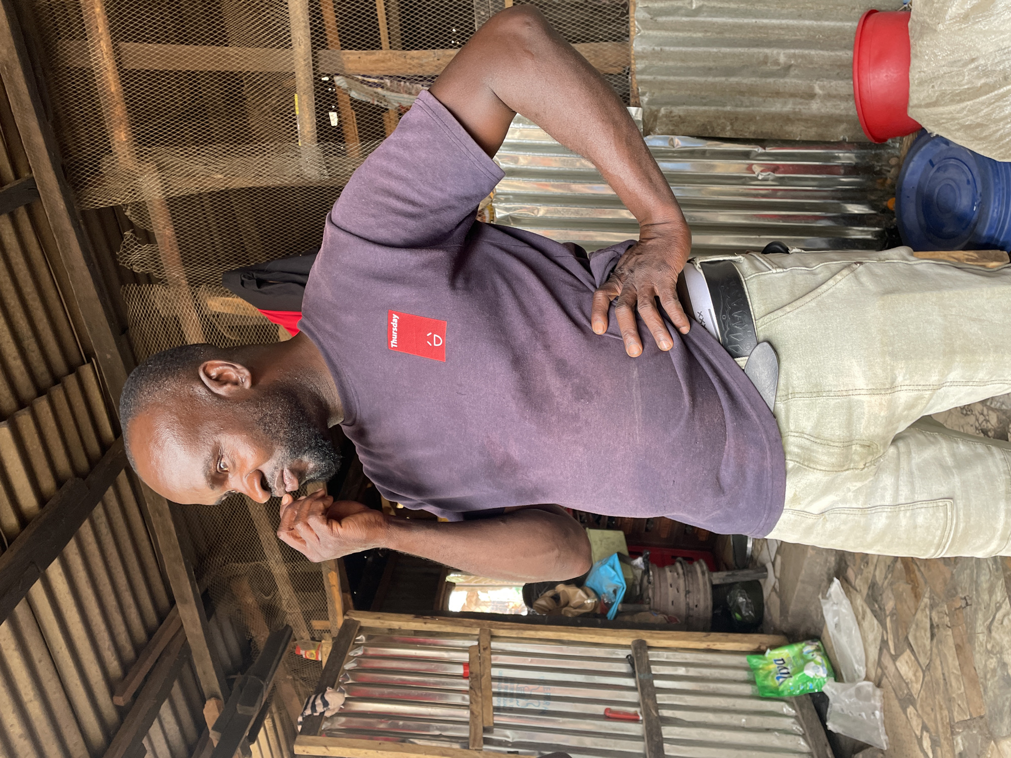 An adult male with dark skin and a beard stands within a semi-enclosed structure in Jos, Nigeria. He wears a dark purple short-sleeved t-shirt with a red rectangular patch displaying "Thursday" text and a smiley face graphic, and light-colored trousers with a visible white underwear band patterned with "XXX". His right hand is raised, fingers touching his mouth, while his left hand rests on his hip. His gaze is directed to the right of the frame. The environment consists of a structure with a corrugated metal roof supported by wooden beams. Walls are constructed from corrugated metal sheets and wooden planks, with a section of metal mesh acting as a partition behind the man. The floor is made of uneven, irregularly shaped stone tiles. Visible objects include a green plastic bag with a "Viva" logo and clear plastic bags on the left side of the frame, and a red plastic basin, a blue plastic lid, and a light-colored sack on the right. A red jacket hangs on the metal mesh wall. Through an opening on the left, stacked circular wooden objects and a blue plastic bag are partially visible.